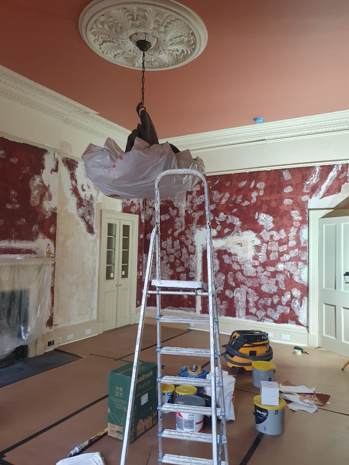 Full protection of floors and furniture, followed by careful removal of existing wallpaper throughout the rooms.